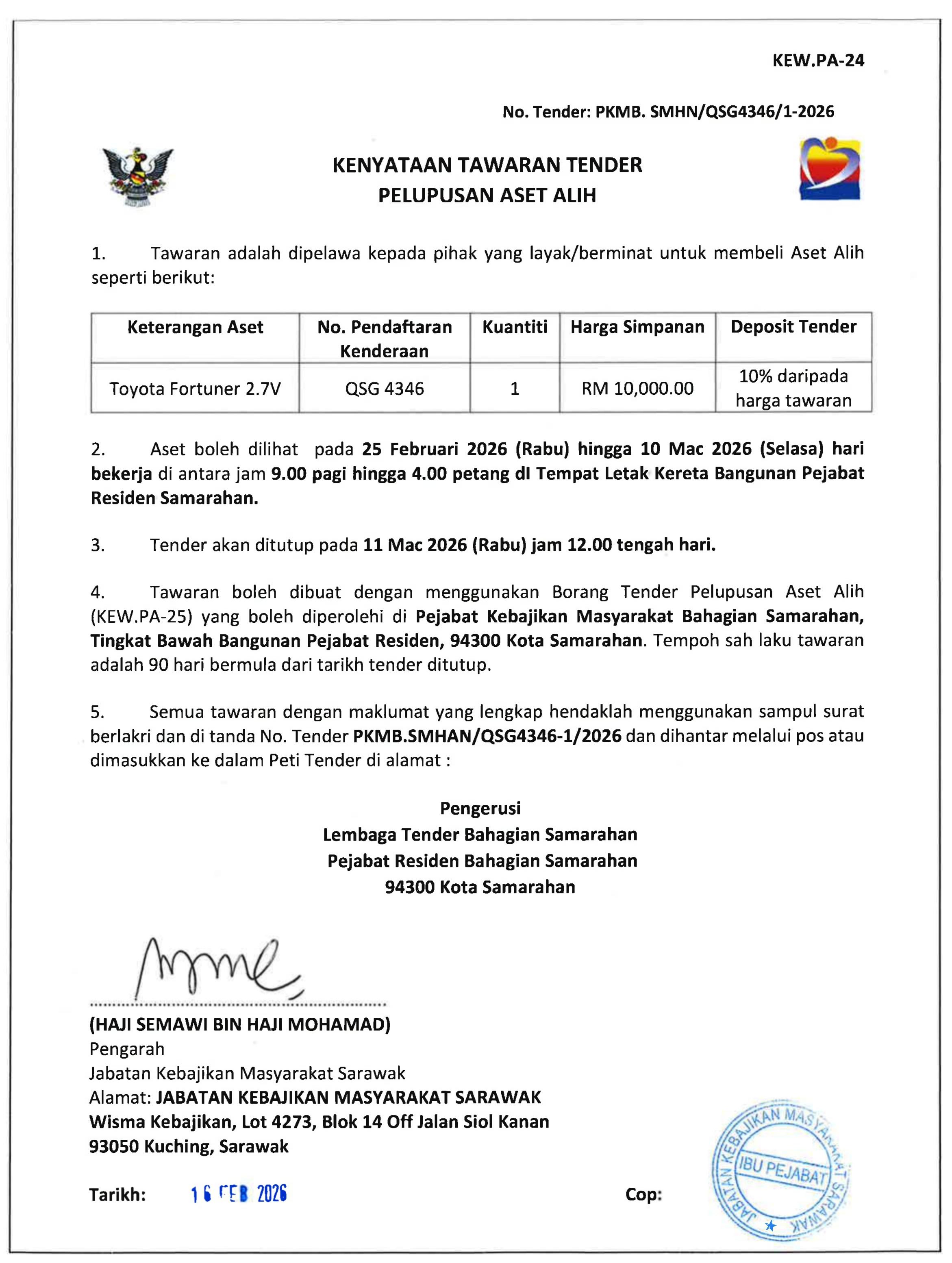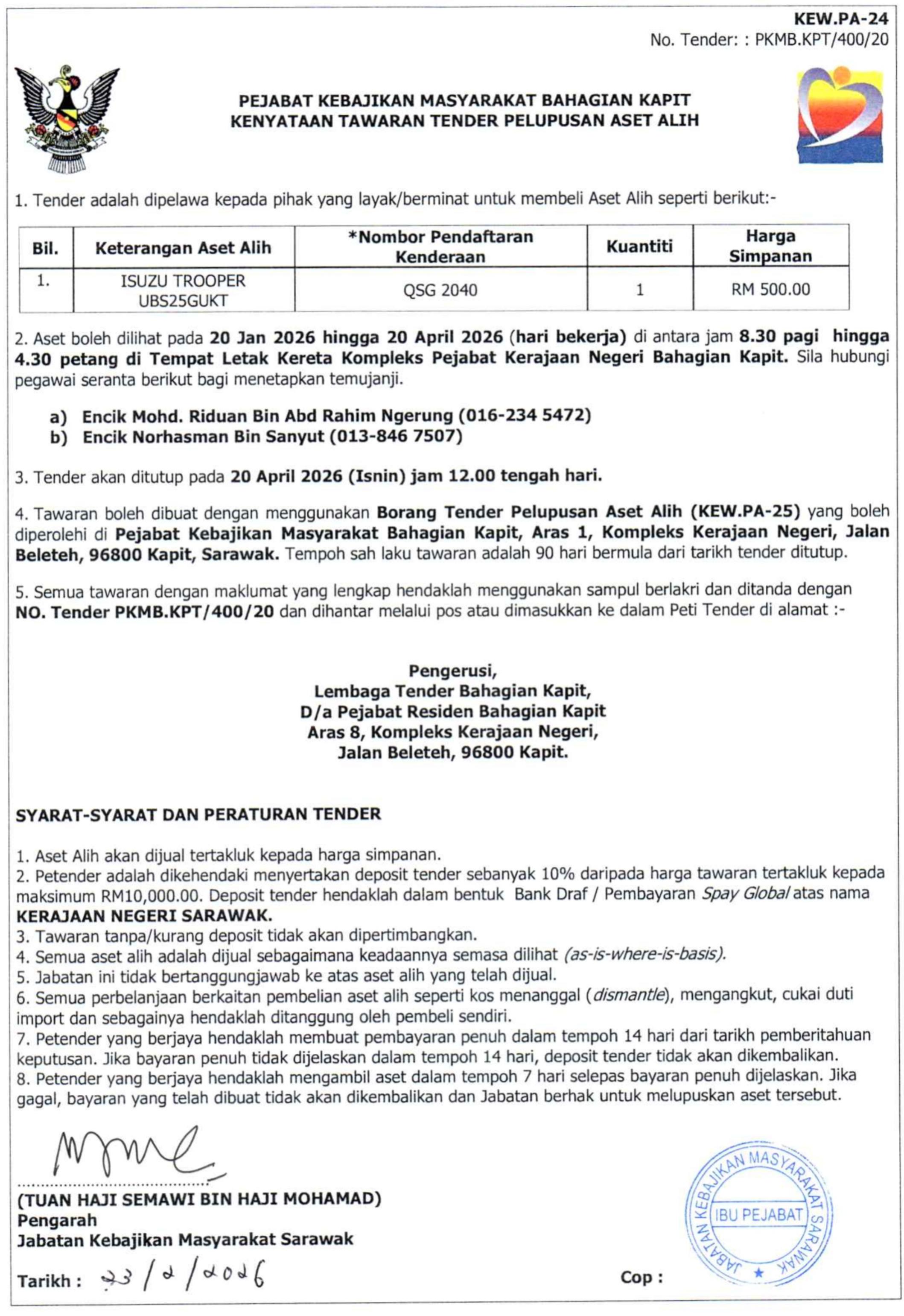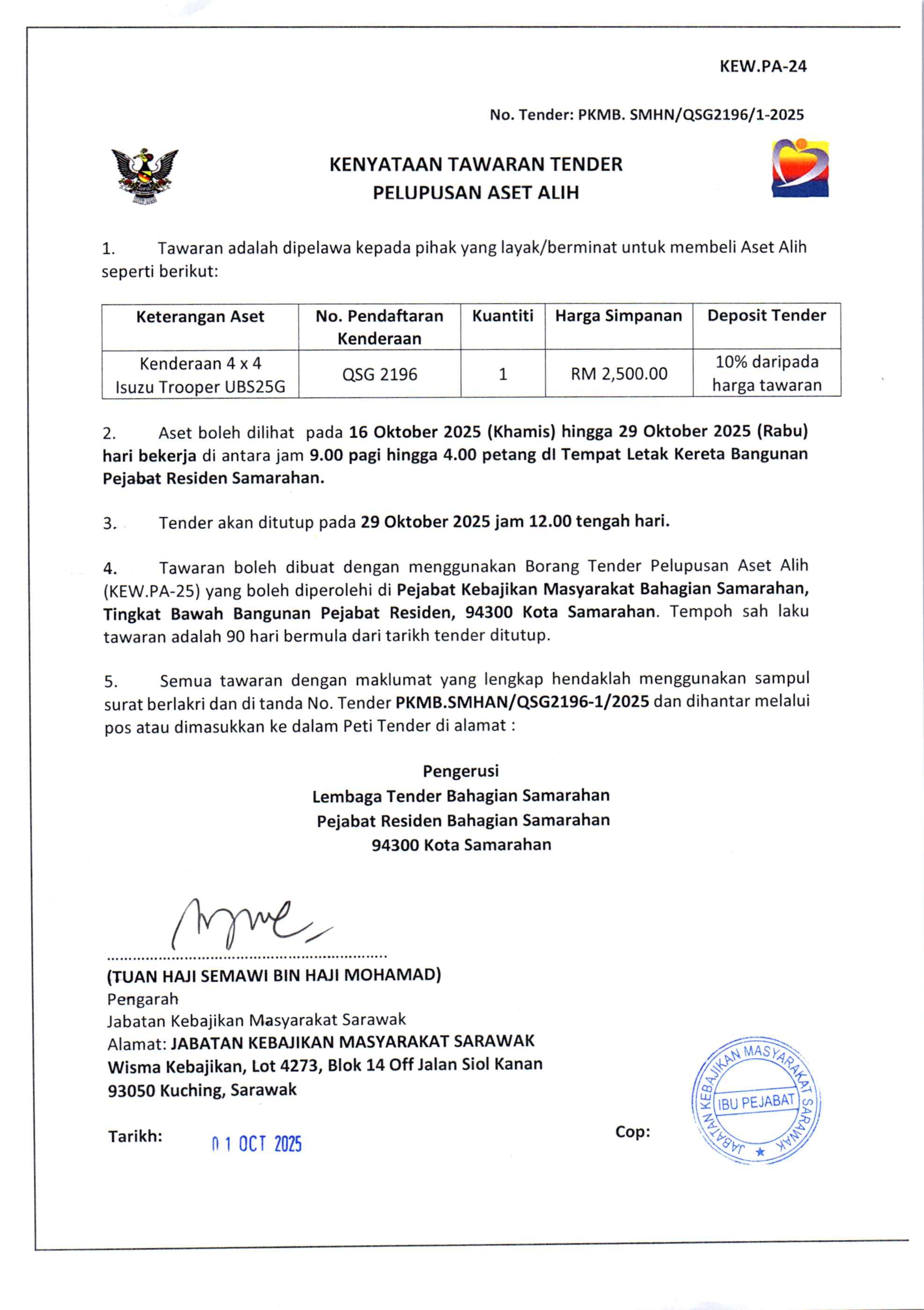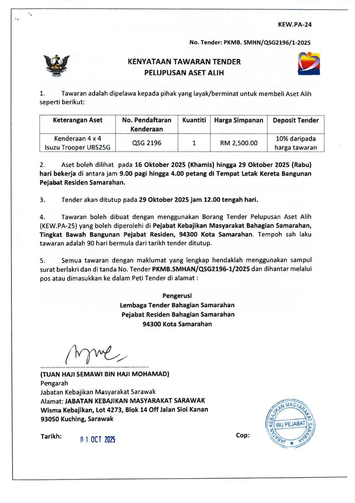 KENYATAAN TAWARAN TENDER PELUPUSAN ASET ALIH