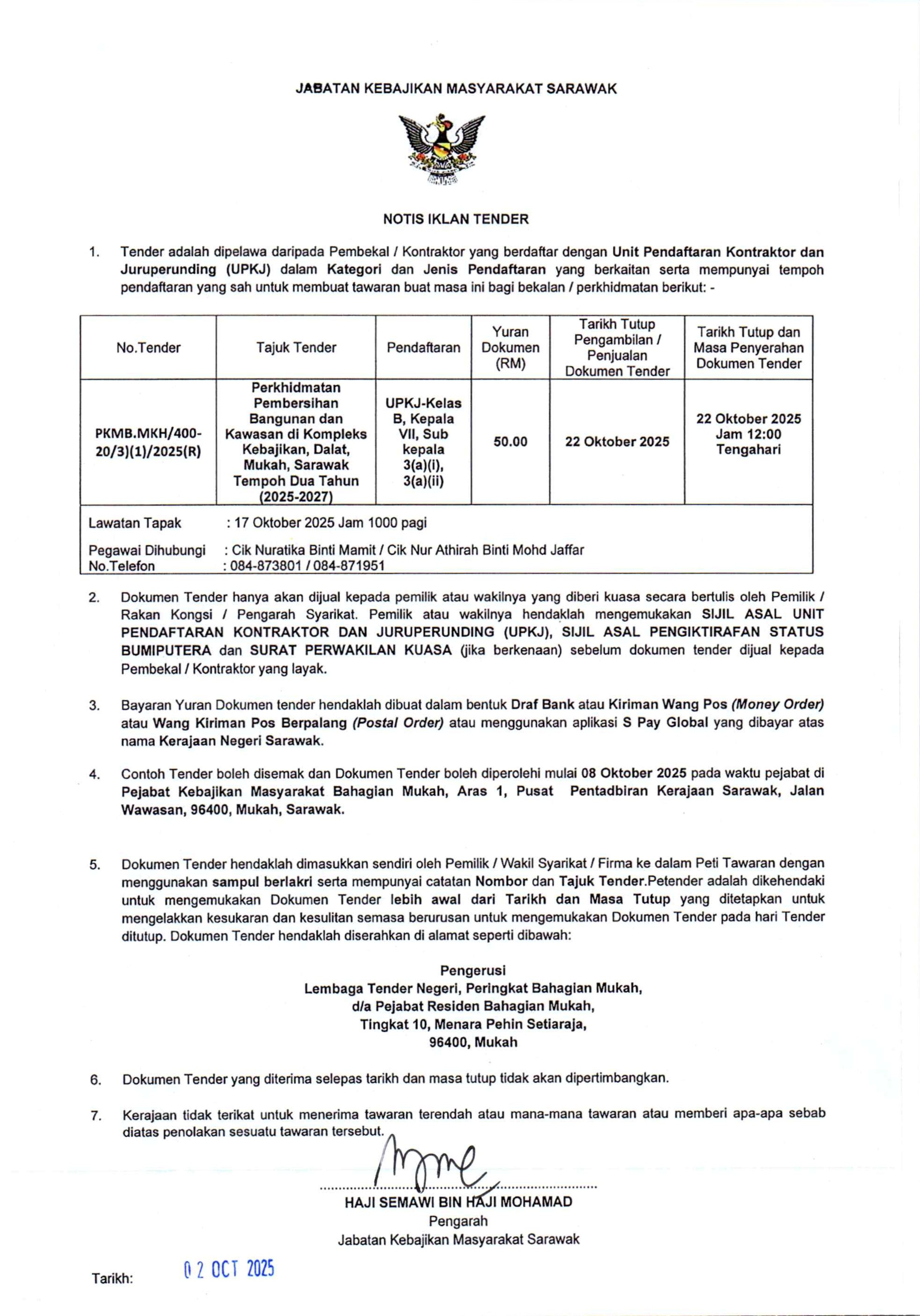 TENDER PERKHIDMATAN PEMBERSIHAN BANGUNAN DAN KAWASAN DI KOMPLEKS KEBAJIKAN, DALAT, MUKAH.