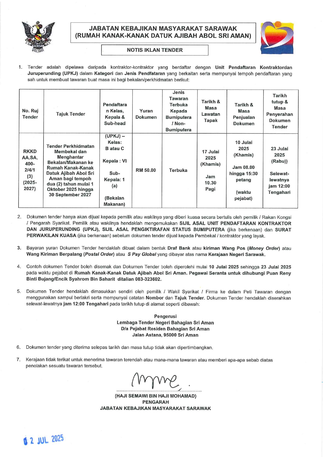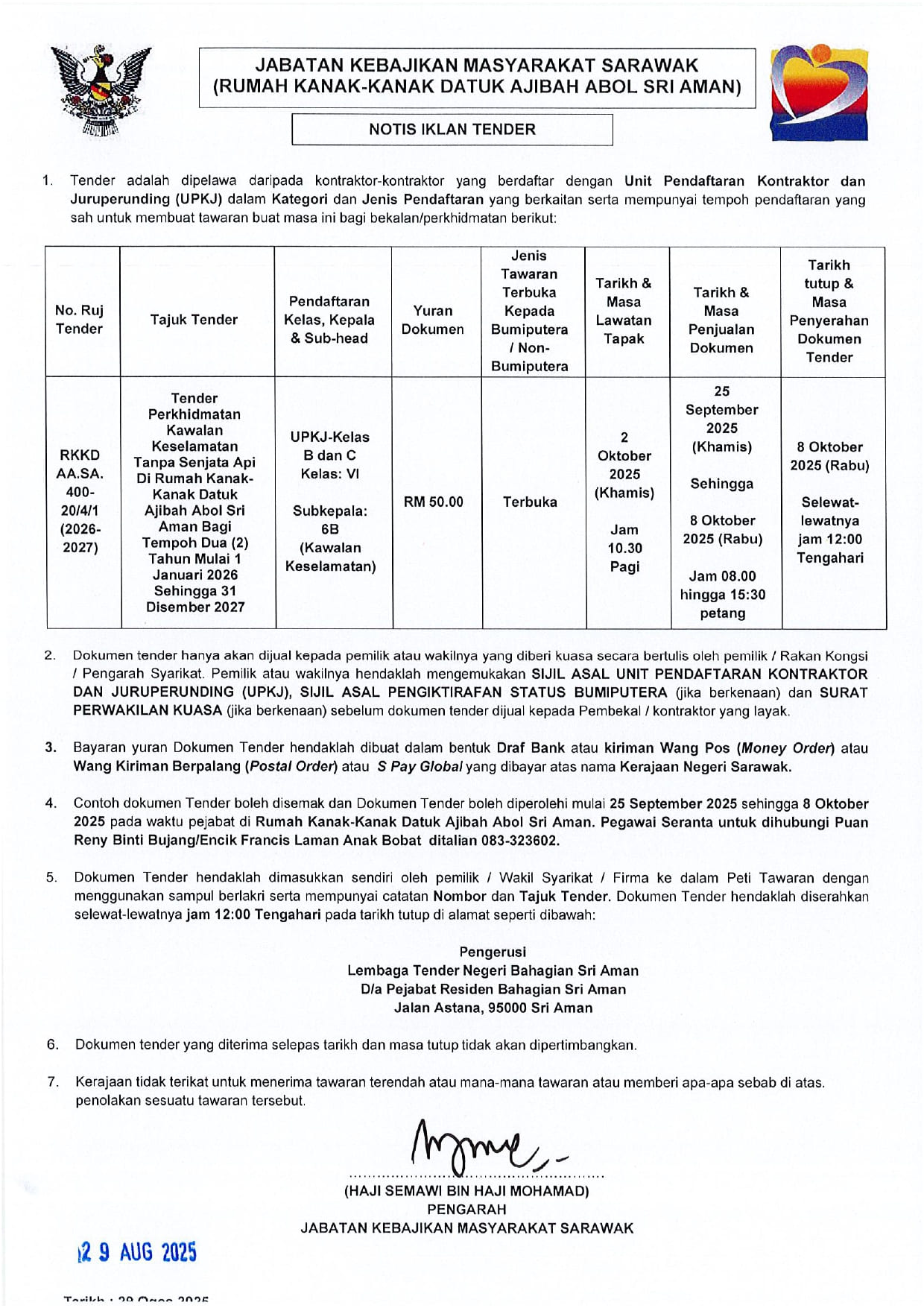 Tender Perkhidmatan Kawalan Keselamatan Tanpa Senjata Api di RKK Datuk Ajibah Abol, Sri Aman